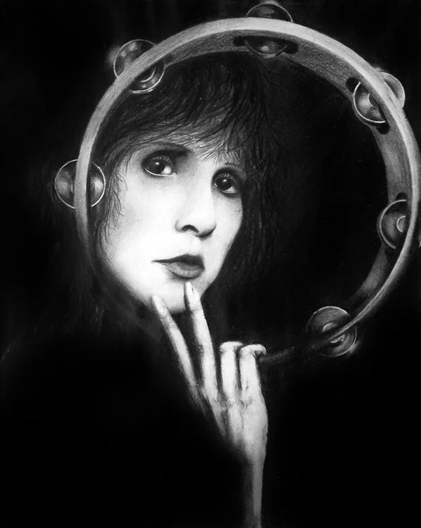 Black and white portrait of a woman with dark hair, around a circular mirror, holding her face with her hand, with dramatic lighting and shadows.