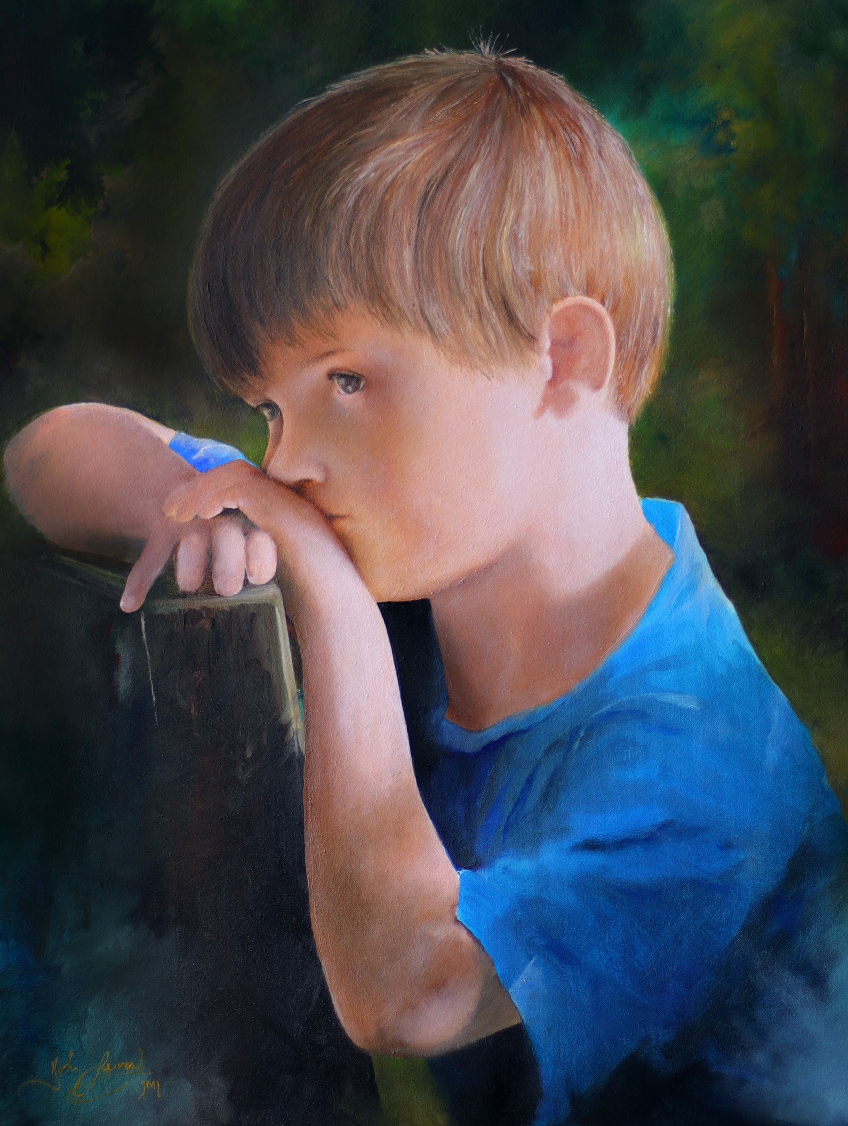 A realistic painting of a young boy with light brown hair, blue eyes, wearing a blue shirt, resting his chin on his arms, gazing thoughtfully into the distance.