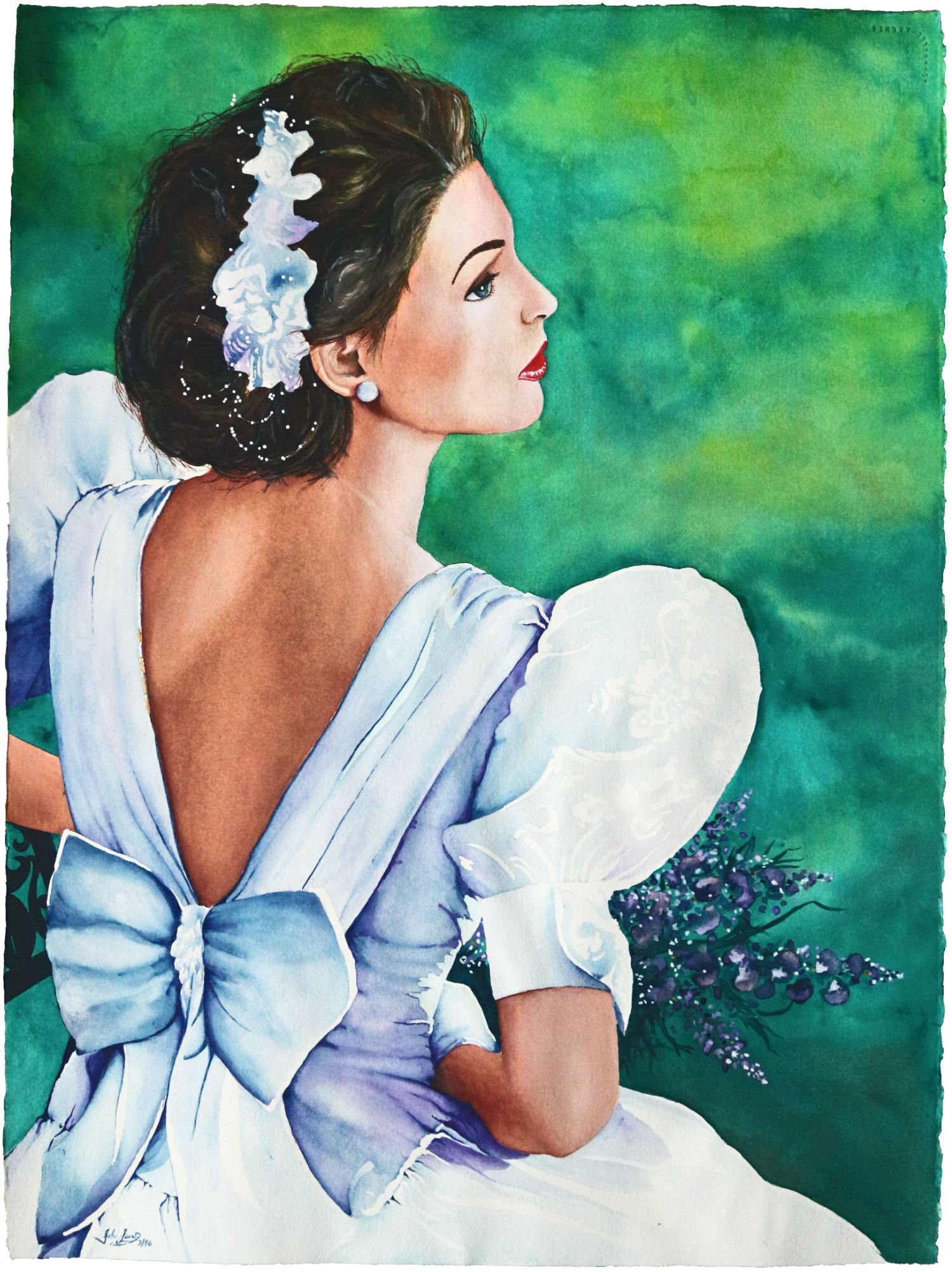 A painting of a woman in a white dress with puffed sleeves, a large bow on her back, and floral decorations in her hair, set against a green background.